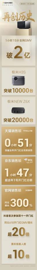其中,極米智能投影H3S銷量突破10000臺,極米NEWZ6X銷量突破20000臺。天貓銷售額僅51分鐘就突破去年開門紅全周期銷售,京東銷售額僅1小時47分就超去年1號開門紅總額,官網(wǎng)銷售額同比增長300%。