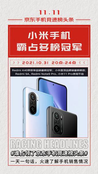 京東11.11首日手機(jī)競速榜發(fā)布:Redmi K40榮獲4小時銷量冠軍