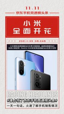 京東11.11競速榜還顯示,1500-2000元價位段,Redmi Note 11 Pro位列第一、小米11青春版位列第二、三星 Galaxy F52位列第三;2000-3000元價位段,2021年爆款旗艦Redmi K40穩居第一、榮耀50位列第二、榮耀X10位列第三;3000-5000元價位段,小米11位列第一、iPhone 11位列第二、華為P50位列第三;5000-10000元價位段,iPhone 13位列第一、iPhone 12位列第二、小米MIX4位列第三。