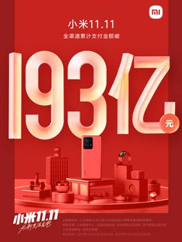 家電消費網11月12日訊 今天,小米集團發布的雙十一戰報顯示,截至11日23時59分,小米新零售全渠道支付金額突破193億,同比增35%。小米手機在全平臺銷量第一。