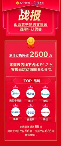 蘇寧易購零售云811訂貨會數據顯示,家居品類銷售量整體同比增長117%,其中,喜臨門銷售量增長100%、四季沐歌銷售量增長150%。此外,眾多合作品牌銷售額實現穩步增長,長虹銷售額同比增長593%,小天鵝銷售額同比增長100%。其中,合肥、成都大區銷售額超4000萬,山西大區超2500萬。