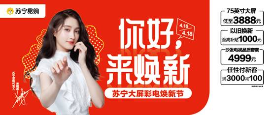 目前,蘇寧大屏彩電煥新節已全面啟動,期間蘇寧還將推出75吋大屏彩電低至3888元,以舊換新至高補貼1000元,沙發電視套購4999元等超值福利。