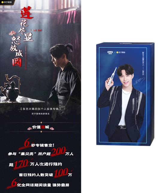 張藝興第四張實體專輯《蓮》在蘇寧易購獨家首發(fā),僅預(yù)售不到一天,便有百萬人預(yù)約,4月19日晚10:07開售,僅6秒便被搶購一空。同時蘇寧歐樂B張藝興專屬禮盒首發(fā)即秒空,4月19日歐樂B蘇寧官方旗艦店流量同比增長976%,銷量同比增長323%。此次蘇寧易購與歐樂B的緊密聯(lián)動,實現(xiàn)了聲量和銷量的雙重獲勝。
