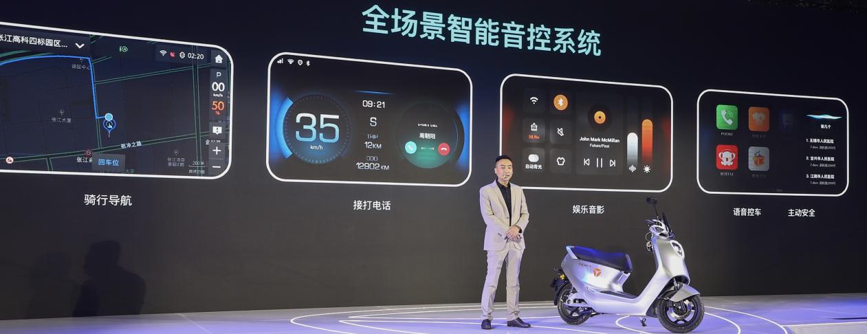 在新展示的產品中,雅迪為電動車裝上了一塊小型中控屏,并將智能導航、語音控制等功能一并加入到了新產品中。在發布會現場,雅迪科技集團智能網聯中心資深總監沈長海現場親自向與會媒體們示范展示雅迪冠智2.0系列的導航、查詢天氣等智能功能。而基于安卓系統,雅迪冠智2.0系列甚至還能實現包括收聽喜馬拉雅、酷我音樂等智能體驗,形成騎行場景中的全場景生態。