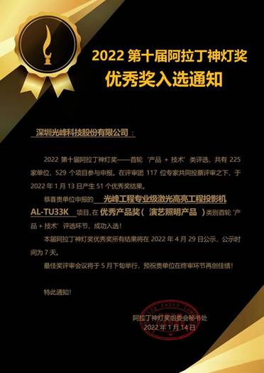 歷經1個多月的復審投票及線上路演匯報,光峰工程AL-TU33K工程投影機,榮獲2022年阿拉丁神燈獎優秀產品獎。