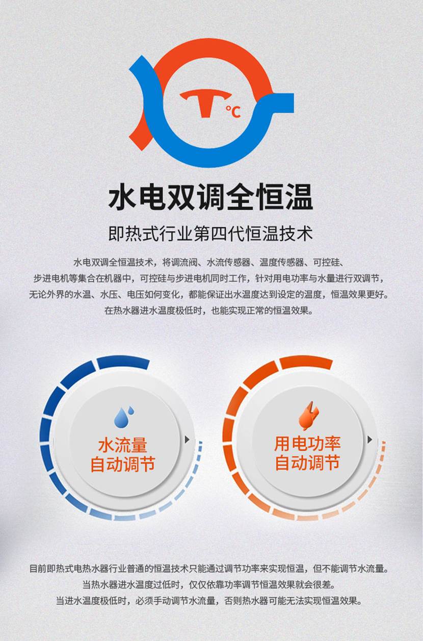 水電雙調(diào)全恒溫技術(shù),可以同時(shí)自動(dòng)調(diào)節(jié)用電功率與水量,無(wú)論外界的水溫、水壓、電壓如何變化,都能保證出水溫度達(dá)到設(shè)定的溫度,恒溫效果更好。在熱水器進(jìn)水溫度極低時(shí),也能實(shí)現(xiàn)正常的恒溫效果。