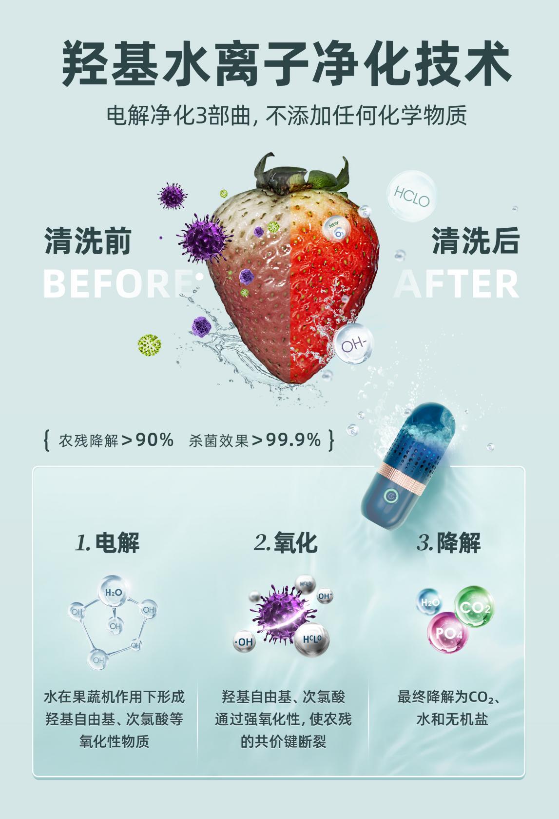 果蔬清洗機的工作原理并不神秘也不玄學,現在市面上主流的果蔬清洗機都是采用了羥基水離子凈化的技術,這種技術通過以水為原料,利用電解水產生具有強氧化性的“羥基自由基”,可以非常輕松的將農藥、抗生素、激素等污染物的分子結構破壞,并將污染物降解為對人體無害的物質,比如水、二氧化碳和無機鹽,最后再用清水沖洗就能做到將細菌、農殘有效去除。