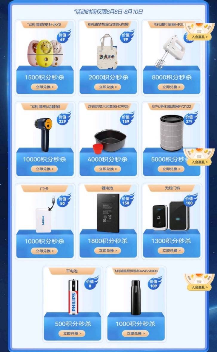 飛利浦家電開啟超值積分換購活動,優品好物獻禮會員。會員在活動期間可用積分直換甄選好物,飛利浦打蛋器,飛利浦電動鞋刷樂兌不停,等你來拿(限量兌換,換完即止)。更有超多豐富系列產品積分加錢購,多款明星好物等你來換!(各平臺具體活動時間見下方標注②)