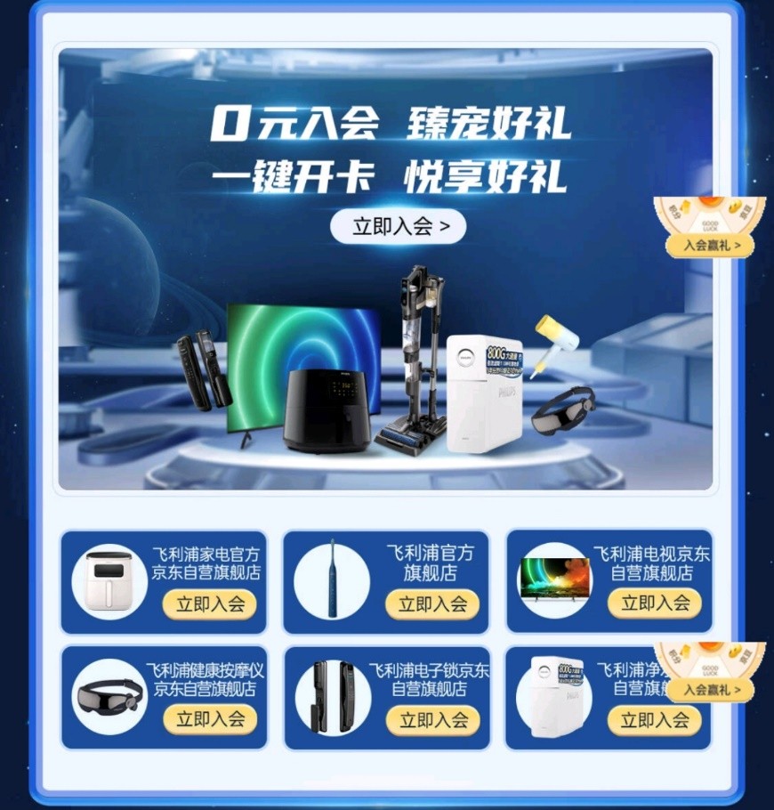 在活動期間,飛利浦家電、飛利浦健康生活,飛利浦健康按摩,飛利浦水健康、飛利浦電視與飛利浦智能鎖六大品類的用戶可聯合入會(僅限天貓及京東線上商城),成為會員即可參與抽獎活動,神秘好禮等你來拿!(各平臺具體活動時間見下方標注③)此外,8月1日起至8月31日,會員登陸天貓、京東線上商城有機會獲得0元試用機會。