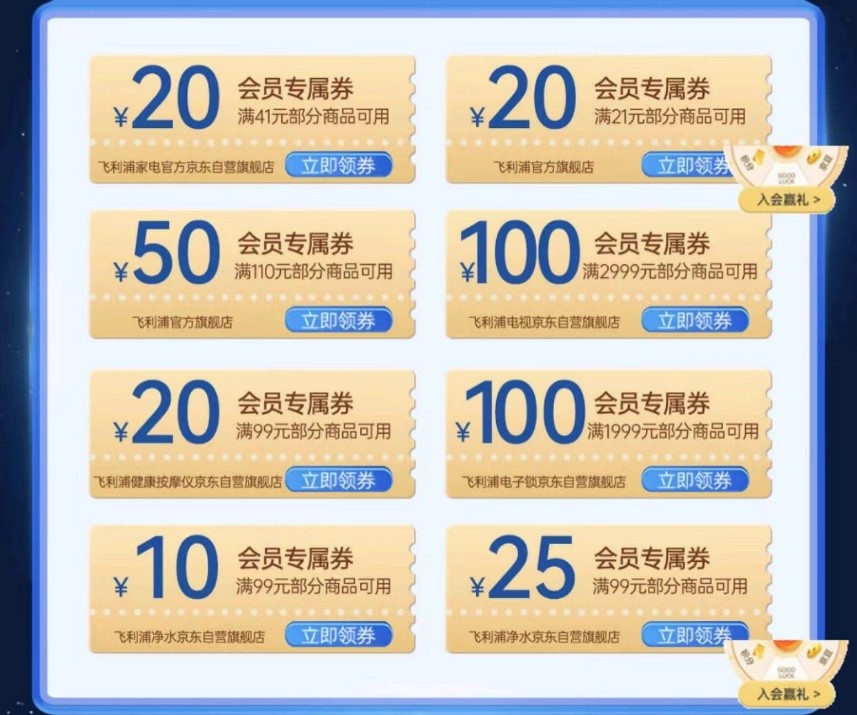 無門檻優惠券豪氣到賬,還沒加入的用戶們趕緊上車!活動期間用戶在天貓、京東、抖音、微商城四大平臺注冊飛利浦家電新會員即送100積分,并可領取飛利浦家電產品20元無門檻優惠券(使用規則詳見各平臺活動信息)。