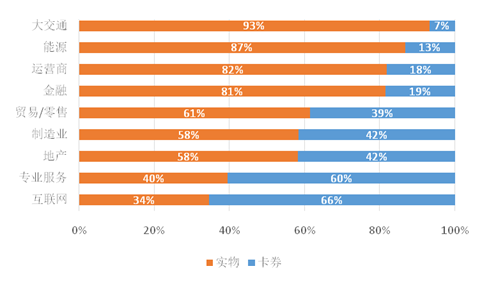 分行業來看,互聯網、專業服務等行業企業相對更偏好靈活型的員工福利發放方式,更多選擇用禮品卡實現彈性福利。而交通、能源等相對傳統的行業的企業則更加看重福利的實用性,偏愛選擇實物類商品作為員工年貨福利。