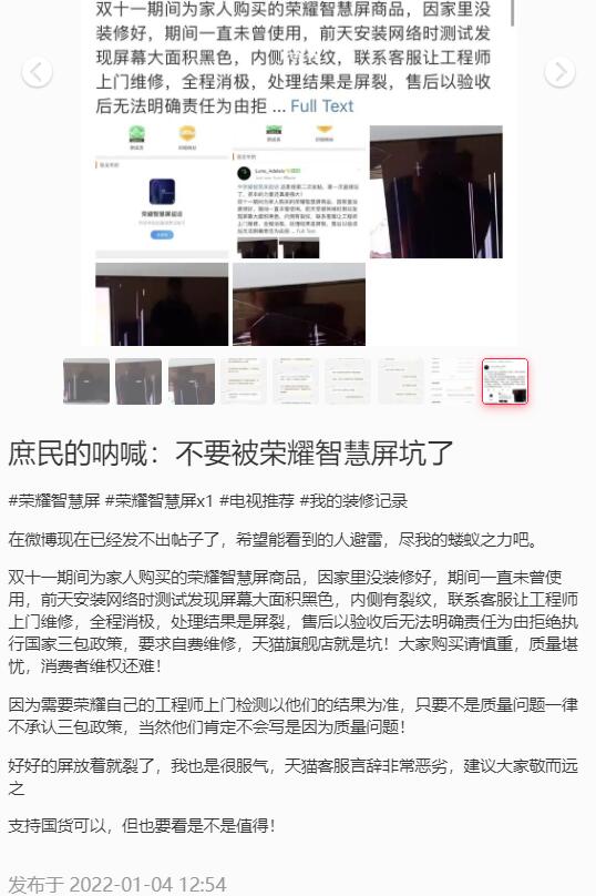 “質(zhì)量堪憂,消費(fèi)者維權(quán)還難!”他呼吁消費(fèi)者慎重購(gòu)買(mǎi)榮耀智慧屏,因?yàn)?ldquo;在微博現(xiàn)在已經(jīng)發(fā)不出帖子了,希望能看到的人避雷,盡我的螻蟻之力吧。”