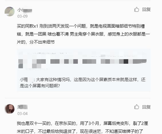 今年3月9日,有消費(fèi)者吐槽,其榮耀智慧屏x1觀看兩天就發(fā)電視畫(huà)面暗部細(xì)節(jié)特別糟糕,就是一團(tuán)黑,什么也看不清,男主角穿個(gè)黑衣服,感覺(jué)身上的衣服都是一片的,分不出來(lái)細(xì)節(jié)。