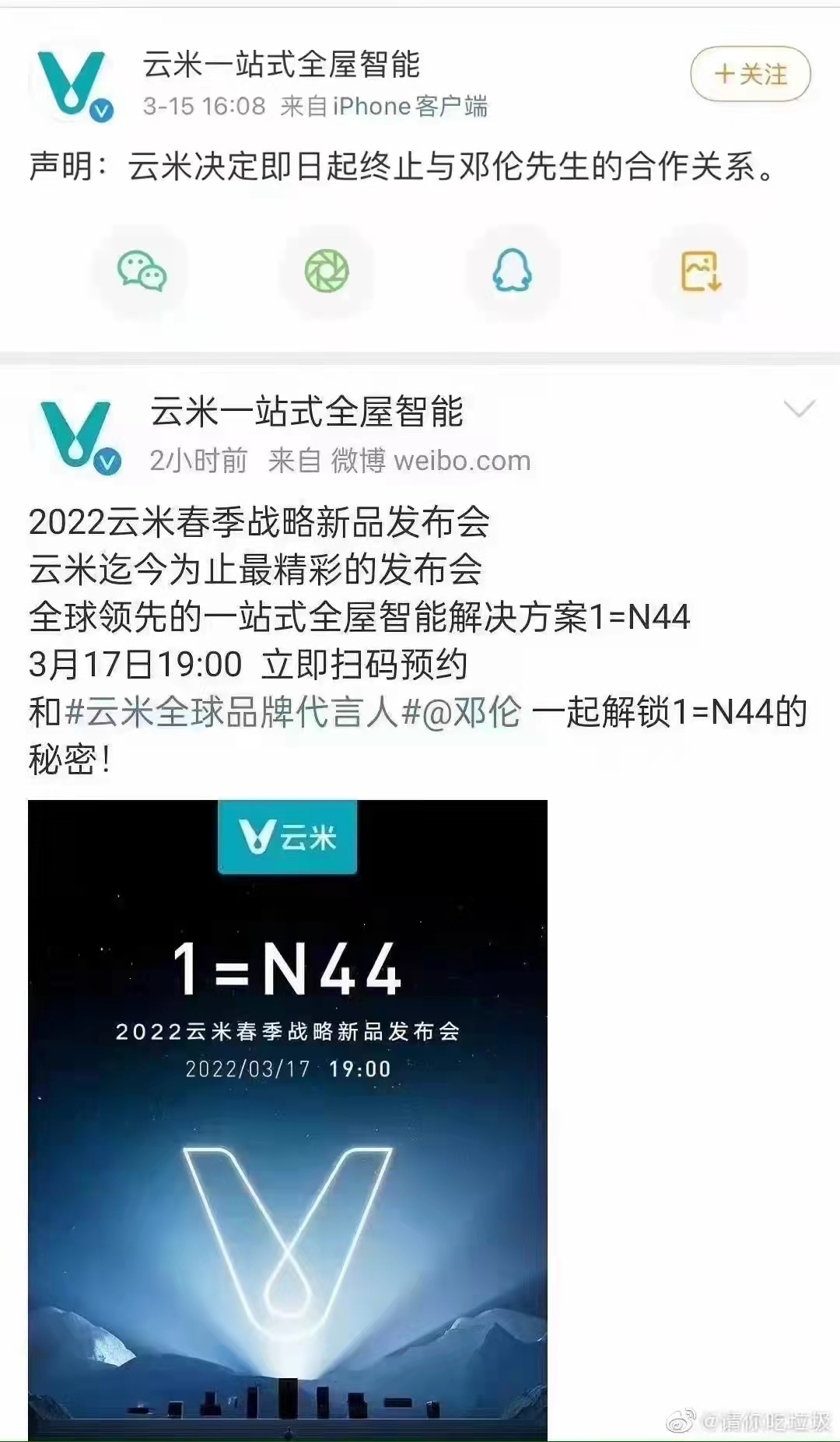 據(jù)了解,2021年9月,云米對外宣布鄧倫成為云米全球品牌代言人。今天上午,云米還對外宣布,鄧倫將參加其后天舉辦的新品發(fā)布會。