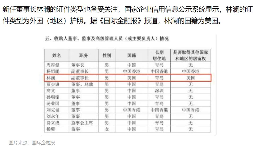 新任董事長林瀾的證件類型也備受關注,國家企業(yè)信用信息公示系統顯示,林瀾的證件類型為外國(地區(qū))護照。據《國際金融報》報道,林瀾的國籍為美國。
