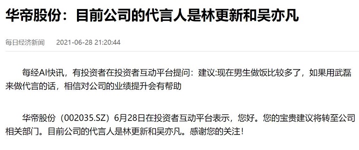 在去年6月28日,華帝在投資者互動平臺表示,目前公司的代言人是林更新和吳亦凡。