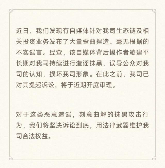 小米公司表示,“近日,發現有自媒體針對我司生態鏈及相關投資業務發布了大量歪曲捏造、 毫無根據的不實謠言。經查,該自媒體背后操作者凌建平長期對我司持續進行造謠抹黑,誤導公眾對我司的認知,損壞我司形象。在此之前,我司已對其提起訴訟,將于近期開庭審理。”