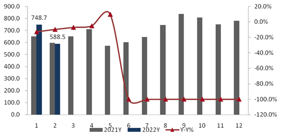 家電消費網4月1日訊 今天,我國大數據公司產業在線發布的2022年1-2月彩電數據顯示:彩電內銷出貨607萬臺,同比下滑6.0%;出口1322萬臺,同比增長5.8%。