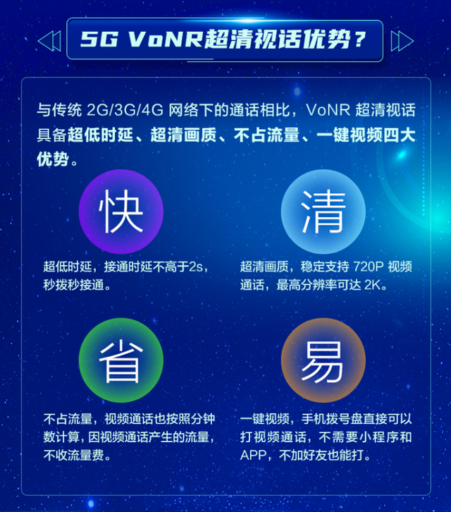 相比2G/3G/4G網(wǎng)絡(luò)下的通話,5G VoNR超清視話功能可以充分利用5G網(wǎng)絡(luò)低延時、超寬帶等特性,為用戶帶來超低延時、720p超清畫質(zhì)、不耗流量和一鍵接通視頻通話等體驗上的優(yōu)勢。