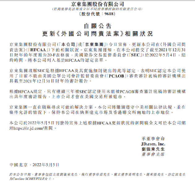 家電消費網5月5日訊 今天,京東針對美國SEC被列入“預摘牌名單”一事在港交所公告稱,在其提交了截至2021年12月31日財年的年度報告20-F表格后,美國證券交易監督委員會(SEC)于紐約時間5月4日將其列入基于《外國公司問責法案》(HFCAA)的認定名單。SEC是根據HFCAA及其實施細則做出的此等認定,表明SEC認定京東集團使用了目前不能由美國公眾公司會計監督委員會(PCAOB)審查審計底稿的審計機構,出具截至2021年12月31日財年的審計報告。根據HFCAA規定,只有連續三年被SEC認定使用未能被PCAOB審查審計底稿的審計機構出具年度審計報告,上市公司才會在美國交易所被退市。