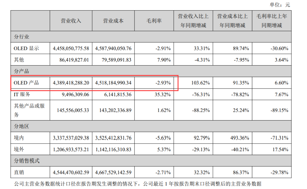 維信諾為何巨虧?其財報顯示,雖然維信諾OLED產品的收入同比增103%,達到43.89億元,但同時營業成本已達到45.18億元,毛利率只有-2.93%。也就是說,維信諾的OLED“賣得越多、虧得越多”。