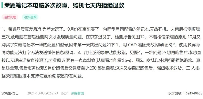 據了解,從2018年以來,網上就可以看到有不少消費者對榮耀筆記本電腦進行投訴。主要集中在產品質量差,藍牙連接卡頓,售后服務差等方面。
