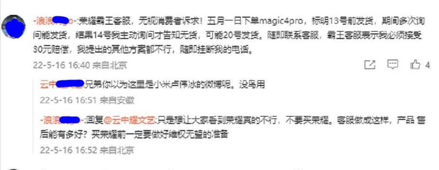 據了解,在榮耀2018年以來進軍筆記本電腦市場,就可以看到有不少消費者對榮耀筆記本電腦進行投訴。主要集中在產品質量差,藍牙連接卡頓,售后服務差等方面。昨天,榮耀發布了MagicBook 14后,有網友直接到榮耀CEO趙明的微博下討說法,認為榮耀售后服務差,不建議購買榮耀產品。(杜佳)