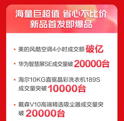 其中航,31日晚8點后的10分鐘,4小時中美的風酷空調成交額就突破1億元。京東618開門紅當天,華為智慧屏SE成交量破20000臺,海爾10KG直驅晶彩洗衣機189S成交量突破10000臺,戴森V10高端精選吸塵器成交量突破20000臺,美的485薄系列十字門冰箱新品首發成交量超3100臺,美的嵌入式洗碗機新品成交額占比超80%,美的白澤1000G凈水器成交額同比增長超300%,博世壁掛爐新品G5100WE首發成交量成為同品類全年TOP1。(段淺量)