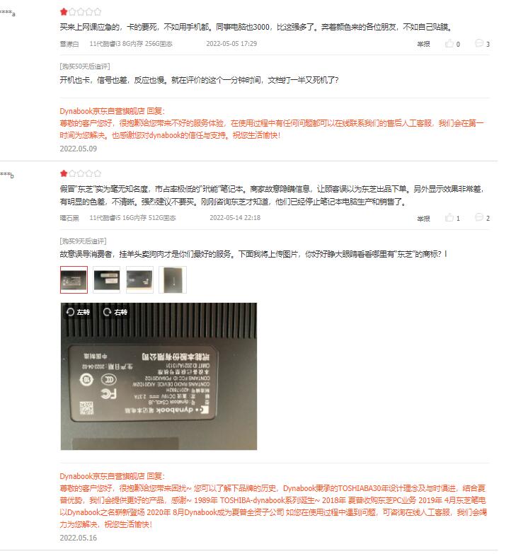 在京東上,還有消費者吐槽稱Dynabook筆記本“卡的要死,不如用手機都。同事電腦也3000元,比這強多了。““開機也卡,信號也差,反應也慢。”“筆記本合上蓋子好大一道縫,還是兩角縫隙小,中間縫隙大,還整個曲屏效果來,我也是醉了,問售后回復都是正常的,再問就沒反應了。”