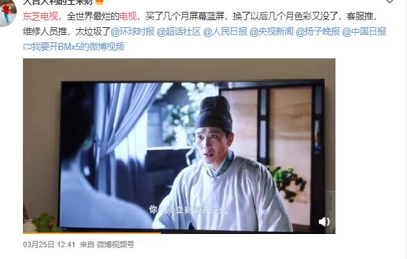 日前,有南京消費者投訴稱,其購買的東芝電視觀看幾個月,屏幕就變成藍色,成為藍屏,找廠家換了一臺新電視后,使用幾個月后又沒有色彩了。“一半黑白,一半彩色,”氣憤的消費者拍了小視頻發到微博上,讓更多消費者看到東芝電視的質量問題。該消費者還表示,找東芝電視客服推諉,找維修人員也推諉,“東芝電視,全世界最爛的電視。”該消費者還@了央視新聞、環球時報、人民日報、中國日報等媒體。