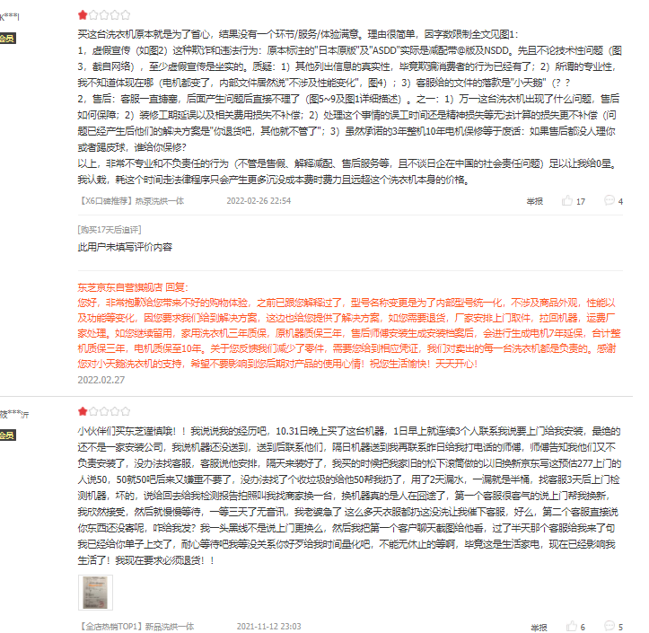 東芝洗衣機則被消費者曝光出是美的旗下小天鵝生產。日前,有消費者吐槽稱,在京東東芝自營旗艦店花1.6499萬元購買的東芝洗衣機X6,到家拆開包裝才發現原標注的"日本原版"及"ASDD"實際是減配帶@版及NSDD,電機都變了,內部文件居然說"不涉及性能變化”,該消費者認為東芝洗衣機涉嫌虛假宣傳,向客服投訴后,發現給其回復的文件落款是美的集團旗下"小天鵝"品牌。(杜佳)
