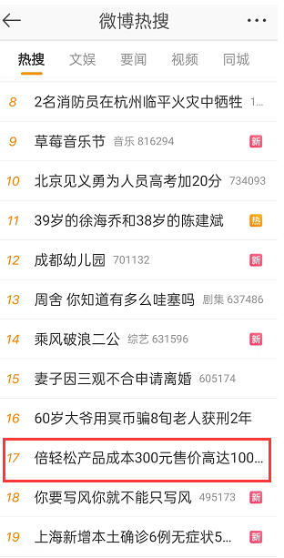 “倍輕松產品成本300元售價高達1000多”上微博熱搜