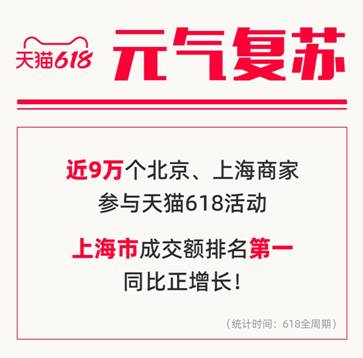 618也成為受疫情影響地區復工復產復市的重要抓手。近9萬個北京、上海商家參與了天貓618活動。在全國直轄市及省會城市中,上海市的成交額排名第一,并且實現了同比正增長,北京市位居第二。