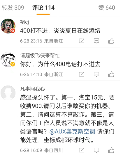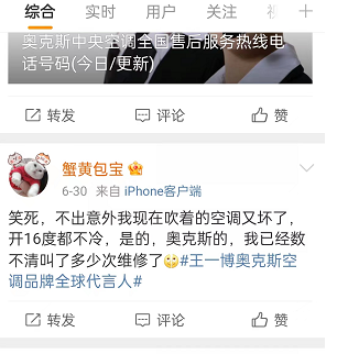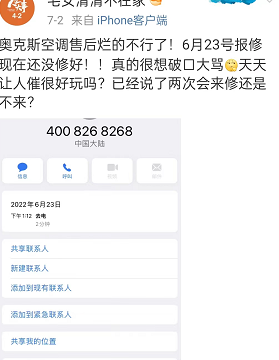 “奧克斯空調又壞了,開16度都不制冷,我已經數不清叫了多少次維修了”;“奧克斯空調售后電話打不通,當地售后人員遲遲不來修,能不能給個說法”;“奧克斯空調售后爛的不行了,6月23日報修,現在還沒修好,已經說了兩次回來修還是不來”;“奧克斯空調400打不進去,炎炎夏日在線添堵”……步入空調銷售旺季的7月,奧克斯空調又被消費者頻頻投訴其售后服務跟不上。