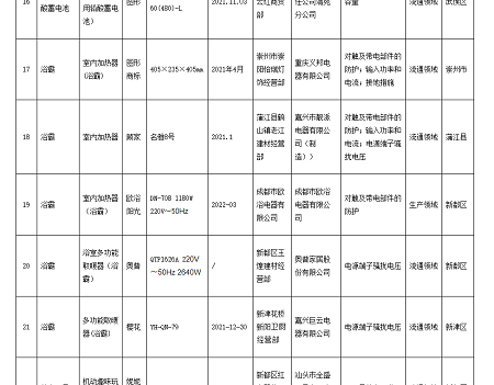 家電消費網7月8日訊 昨天,成都市市場監督管理局發布的2022年浴霸產品質量市級監督抽查情況的通報顯示,抽樣檢驗依據為CCGF-CD-048.4-2020《成都市市場監督管理局浴霸產品質量監督抽查實施細則》,抽查產品19批次,其中生產領域1批次、流通領域18批次。對所抽產品的對觸及帶電部件的防護、輸入功率和電流、耐潮濕(15.3)、泄漏電流和電氣強度、電源連接和外部軟線、接地措施、電源端子騷擾電壓等項目進行了檢驗,檢出6批次產品質量不合格,不合格發現率為31.6%。