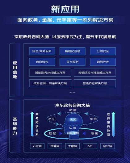 在政務領域,言犀發布了政務咨詢大腦,定位是以服務市民為主,旨在提升市民滿意度、幸福感。基于言犀在智能對話與交互領域的前沿技術,加上言犀在政務服務方面的積累而形成的。在底層,通過人工智能、云計算、大數據等基礎技術能力,打通政務知識體系和政務的服務體系,實現了動態感知、運行監測、決策支撐、聯動指揮的功能,廣泛的應用在民生服務、精細化治理、委辦服務等領域。基于這些能力的積累,京東政務大腦也逐漸形成了多個解決方案,包括政務熱線解決方案、疫情防控與排查解決方案、政務咨詢一網通解決方案、智能養老解決方案。