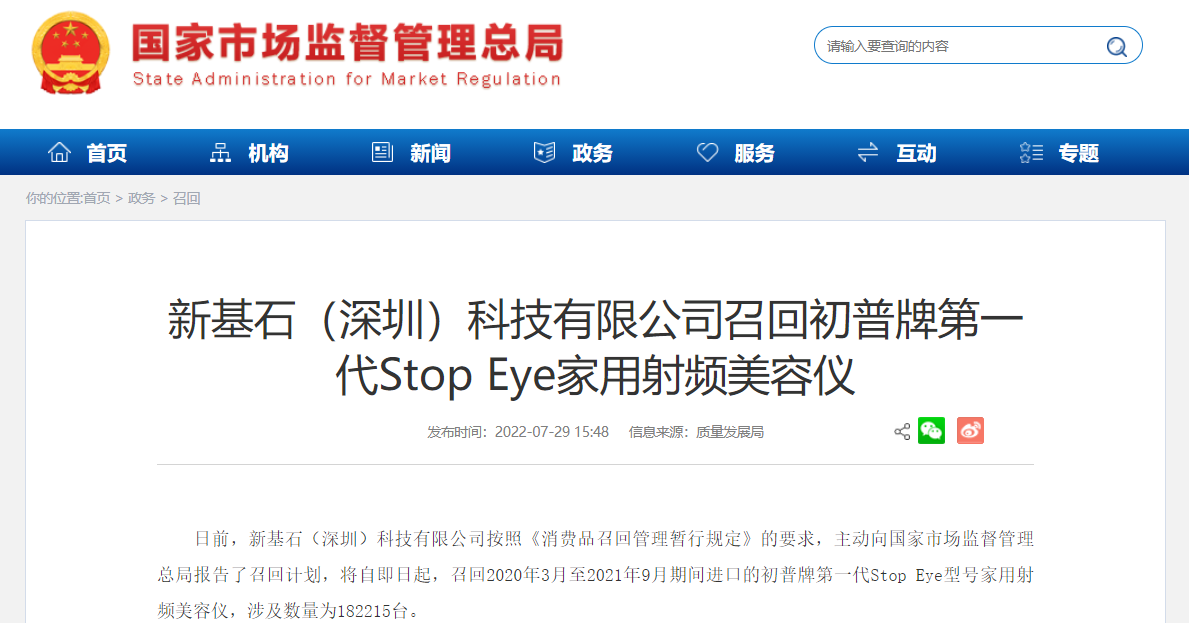 家電消費網7月29日訊 今天,國家市場監督管理總局網站發布消息稱,日前,新基石(深圳)科技有限公司按照《消費品召回管理暫行規定》的要求,主動向國家市場監督管理總局報告了召回計劃,將自即日起,召回2020年3月至2021年9月期間進口的初普牌第一代Stop Eye型號家用射頻美容儀,涉及數量為182215臺。
