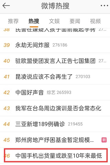 中國手機出貨量或跌至10年來最低沖上熱搜 網友:質量好不用換