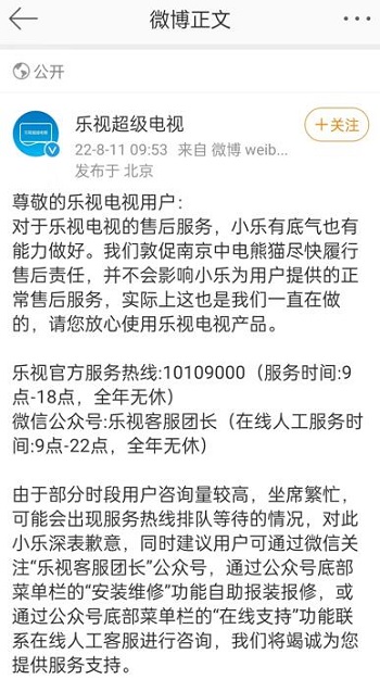 樂視超級電視再發公開信 承諾正常售后服務不會受到影響