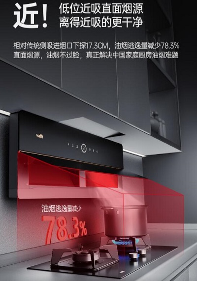 華帝這款煙機(jī)采用的是近吸式,由于離著灶具近,比歐式、側(cè)吸式吸油煙的力度明顯大很多。筆者的最直觀最深刻的感受就是,“距離短,油煙剛出來(lái),就被吸走了。”