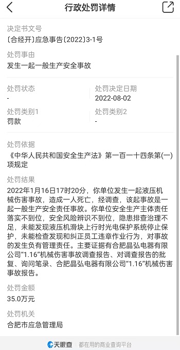 合肥市應(yīng)急管理局行政處罰決定書(﹝合經(jīng)開﹞應(yīng)急事告﹝2022﹞3-1號)顯示,今年1月16日17時20分,合肥晶弘電器有限公司發(fā)生一起液壓機械傷害事故,造成一人死亡,經(jīng)調(diào)查,該起事故是一起一般生產(chǎn)安全責任事故。該單位安全生產(chǎn)主體責任落實不到位,安全風險辨識不到位,隱患排查治理不足,未能發(fā)現(xiàn)液壓機滑塊上行時光電保護系統(tǒng)停止保護,未能檢查發(fā)現(xiàn)和糾正員工違章作業(yè)行為,對事故的發(fā)生負有管理責任。