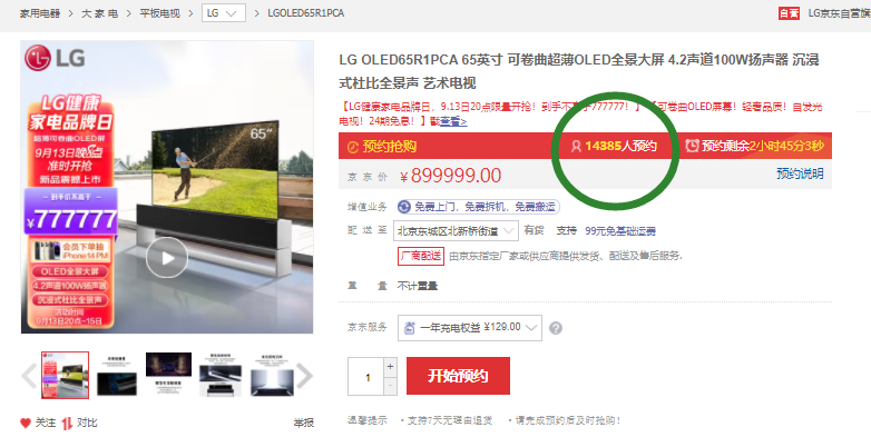家電消費網9月13日訊 昨天,LG在京東上推出了一款65英寸可卷曲OLED電視,售價89.999萬元,促銷價77.777萬元。今天下午,家電消費網看到,京東顯示,預約人數已經達到1.43萬人。對此,專家表示,LG預約不交定金,也就意味著只要點擊就算預約,并不是最后成交數量。京東數據不可信。
