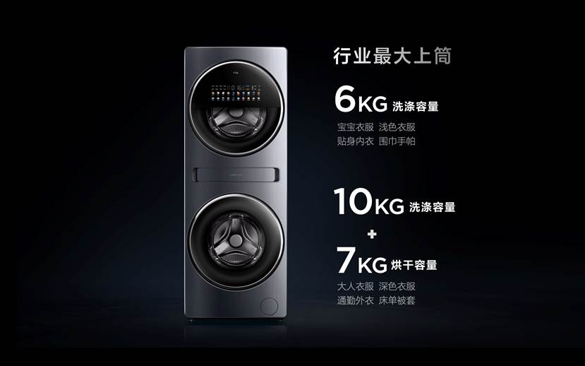 據了解,TCL雙子艙復式分區洗衣機Q10有16kg的超大洗滌容量,其中上筒6kg容量,是目前行業最大的上筒容量。上筒筒徑為510mm,高出行業標配40%以上,實現了1.1的超高洗凈比,做到了行業領先的洗凈效果。