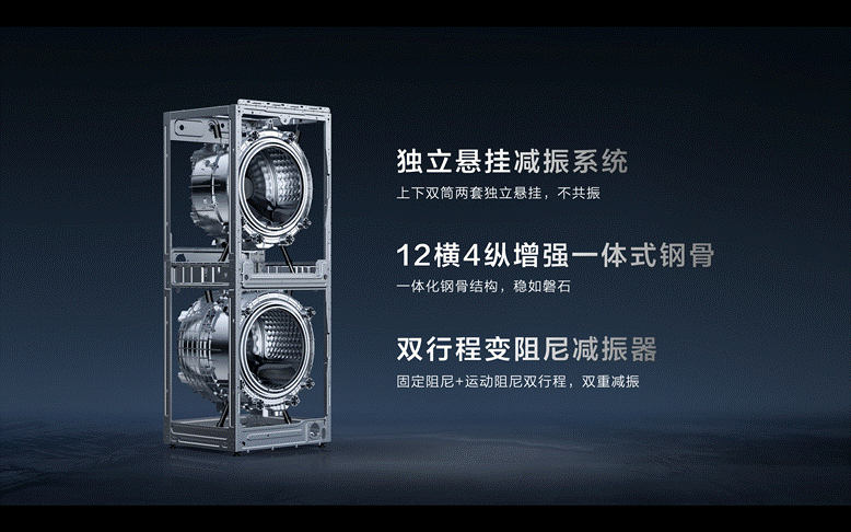 內筒容積增大,意味著引起共振的風險增大。為了克服這一技術難點,TCL 研發團隊參考摩天大樓減震結構,采用 12 橫 4 縱的整機一體式鋼骨結構;專門研發并配置了變阻尼減振器;再施以精湛的高箱體模態切割工藝,搭建起穩定的箱體支撐結構,最終成功推出擁有行業最大上筒——上筒容量達6kg,筒徑達 510mm 的雙子艙復式分區洗衣機。