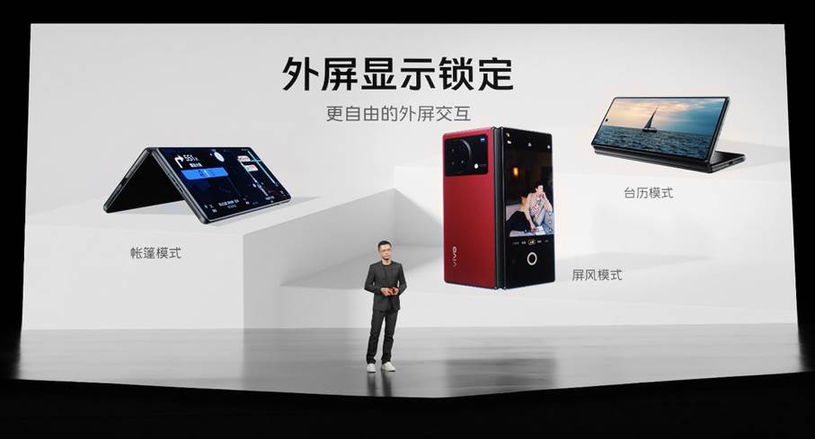 依托于懸停功能,vivo X Fold+可以實現一系列獨特的交互體驗。在WPS軟件上,vivo X Fold+支持演講者模式,懸停狀態下的X Fold+上面是PPT、下面是備注,并且可以通過WiFi直接投屏,使用感受無限趨近與筆記本電腦。懸停通話、懸停觀影等功能更是可以幫助用戶解放雙手;另外,vivo X Fold+的外屏顯示鎖定支持帳篷模式、屏風模式和臺歷模式,為用戶帶來一用難回的使用體驗。
