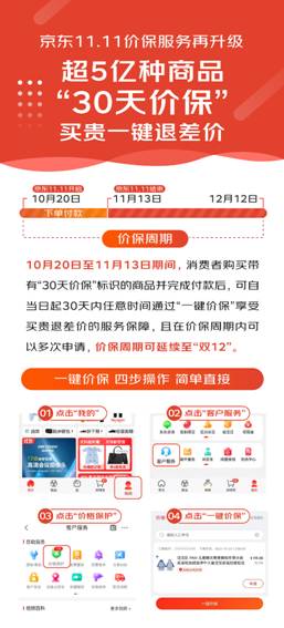 據介紹,10月20日至11月13日期間,消費者購買帶有“30天價保”標識的商品并完成付款后,可自當日起30天內任意時間通過“一鍵價保”享受買貴退差價的服務保障,且在價保周期內可以多次申請,價保時間可延續至“雙12”。