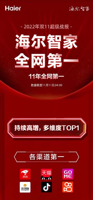 家電消費網11月13日訊 昨天 ,2022年雙十一大戰正式落下帷幕。雙十一家電企業,誰是最大 贏家?家電消費網獲悉,截至11月11日24時,海爾智家實現大家電全網第一,創下11年全網第一的新紀錄。