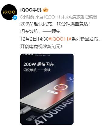 iQOO 11宣布搭載200W超快閃充 稱手機10分鐘充滿