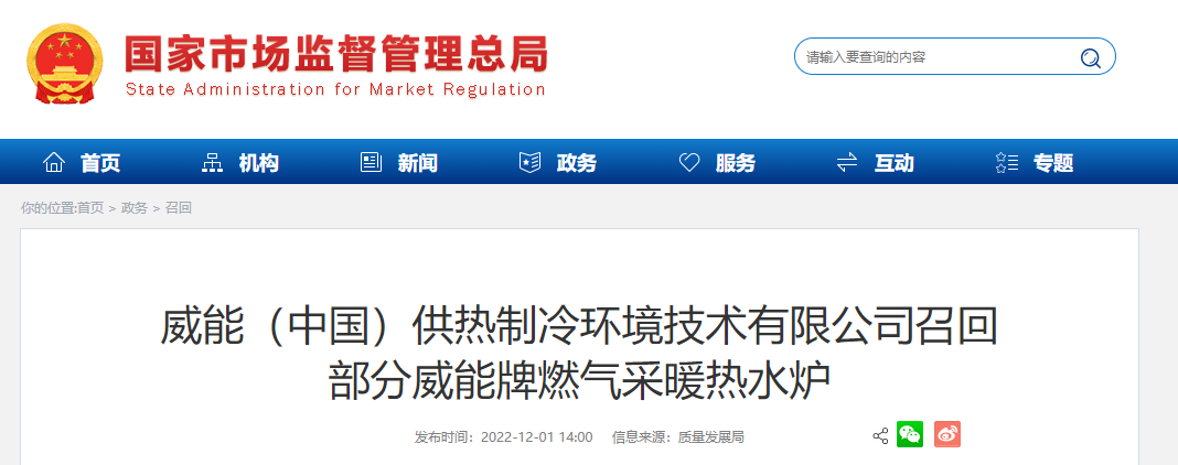 家電消費網12月4日訊 昨天,威能(中國)供熱制冷環境技術有限公司向國家市場監督管理總局報告了主動召回計劃,即日起,召回2021年12月31日前安裝完成的部分威能牌燃氣采暖熱水爐產品,涉及數量483,000件。