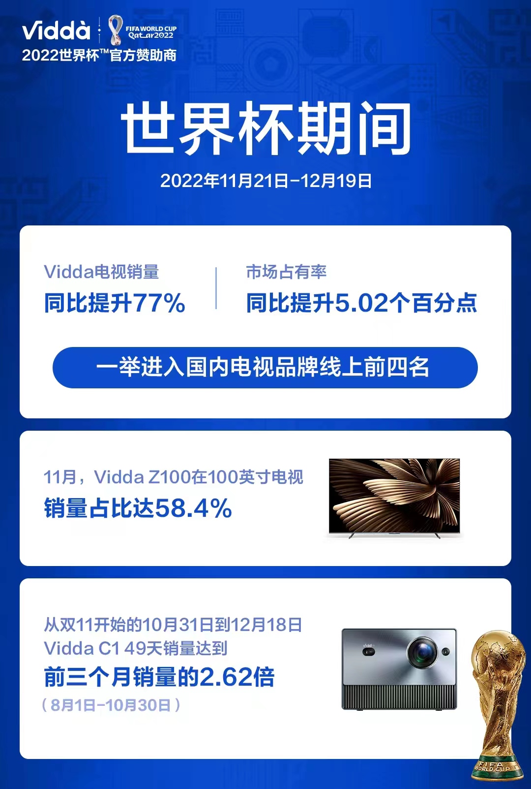 奧維數(shù)據(jù)還顯示,世界杯期間的2022年11月21日-12月19日,Vidda電視銷量同比提升77%,市場占有率同比提升5.02個百分點(diǎn),國內(nèi)線上品牌排名進(jìn)入前四。